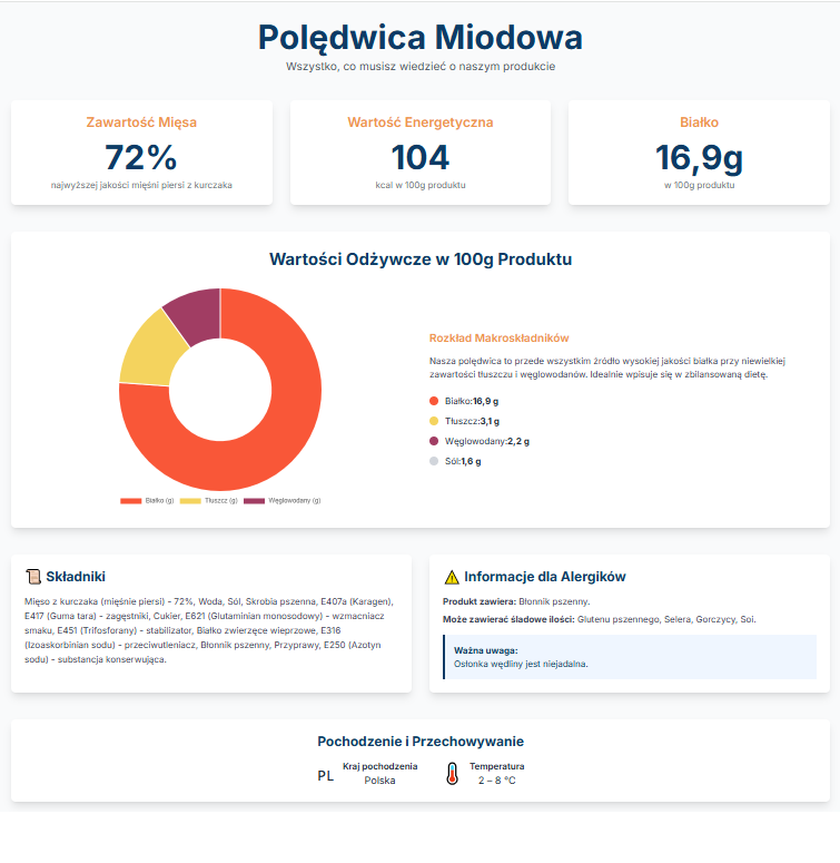 | Składniki | Mięso wieprzowe - 68%, Woda, koncentrat białka sojowego, E451i,E451,E452 – stabilizatory, E407 - substancja zagęszczająca, E316 - przeciwutleniacz, E621 - wzmacniacz smaku, skrobia pszenna, sól, E330 - regulator kwasowości, glukoza, przyprawy, E250 - substancja konserwująca |